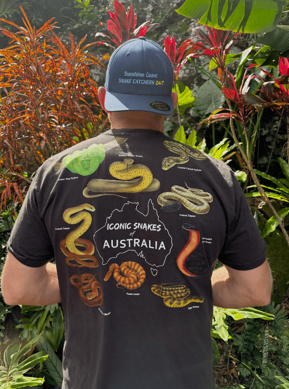 Our Iconic Snakes of Australia shirt showcases nine iconic species including the Inland Taipan, Coastal Taipan, Eastern Brown, Green Tree Python, Death Adder, Tiger Snake, Red-bellied Black Snake, Coastal Carpet Python and King Brown (Mulga).