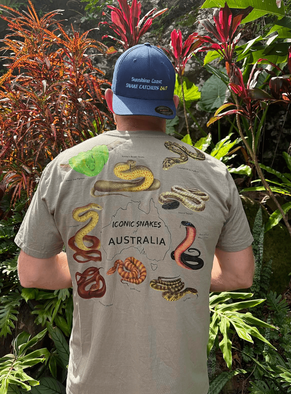 Our Iconic Snakes of Australia shirt showcases nine iconic species including the Inland Taipan, Coastal Taipan, Eastern Brown, Green Tree Python, Death Adder, Tiger Snake, Red-bellied Black Snake, Coastal Carpet Python and King Brown (Mulga).